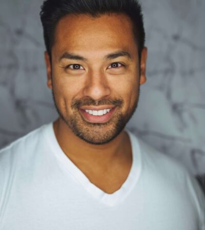 A woman with tattoos on her arms stands outdoors, holding large palm leaves on either side of her face. She is smiling and wearing a white shirt and a long black beaded necklace. The background features blurred greenery and sandy terrain, creating a tropical and relaxed ambiance.